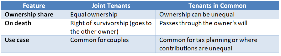 This decision can have real implications, especially in life-changing events like death or separation. For example, if one partner passes away, Joint Tenancy ensures the other automatically inherits the full ownership—regardless of the will. In contrast, Tenants in Common allows each owner to pass their share to someone else via their will, which may be useful in estate planning, particularly for second marriages or when children from previous relationships are involved.